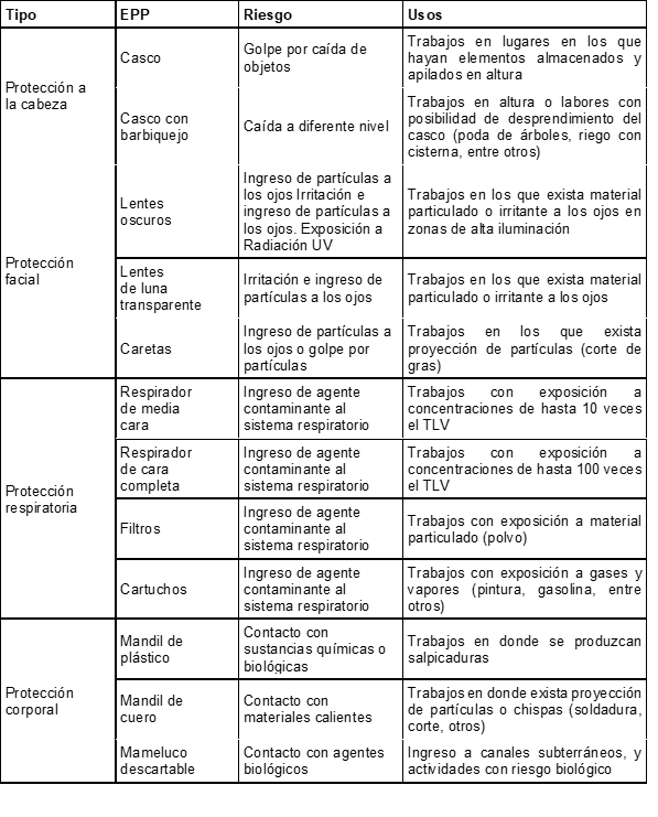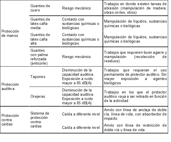El Reglamento de Seguridad y Salud en el Trabajo de los Obreros Municipales del Perú, precisa que, las Municipalidades proveen a los trabajadores los EPPs necesarios, en función a los riesgos existentes en las actividades desarrolladas por los obreros municipales, conforme a la tabla del Anexo 1 de dicha norma. Asimismo, los EPPs deben atender a las medidas antropométricas del trabajador que los utilice, y deben estar certificados con alguno de los estándares internacionales que aprueba el Instituto Nacional de la Calidad.